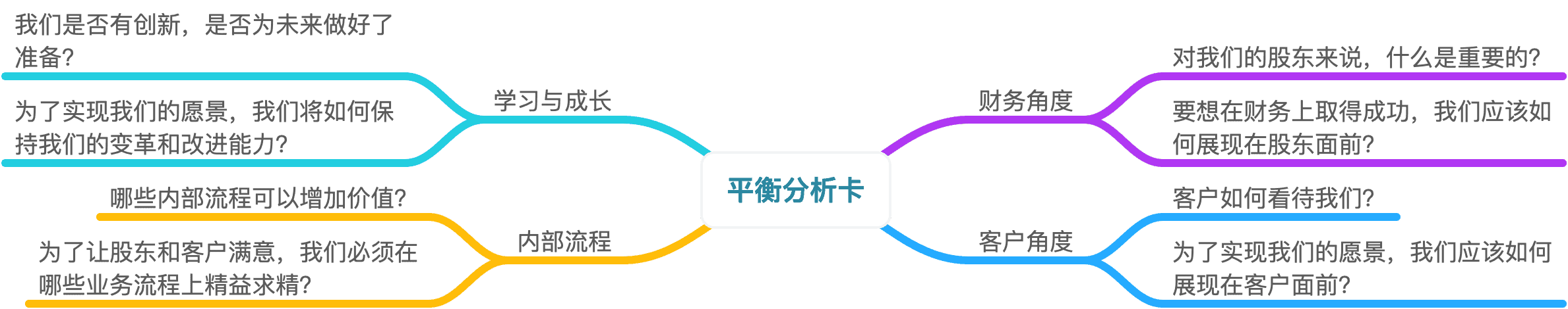 平衡计分卡可以用来替代传统的财务会计方法,因为传统的财务会计方法已经不适合公司的运营。平衡计分卡从四个角度衡量公司的业绩:财务、内部业务流程;学习与成长、客户。财务措施与非财务措施相辅相成,推动长期的财务成功,并从以下几个方面提出问题。
