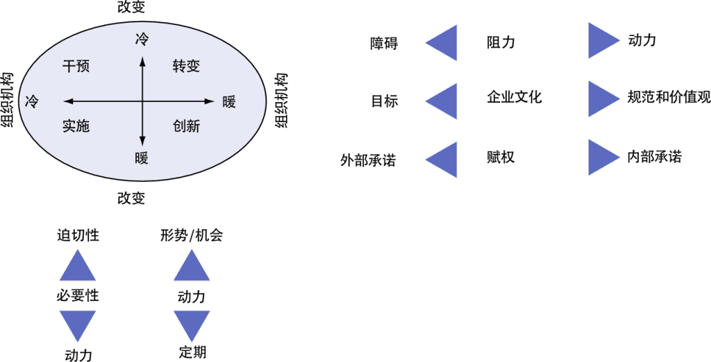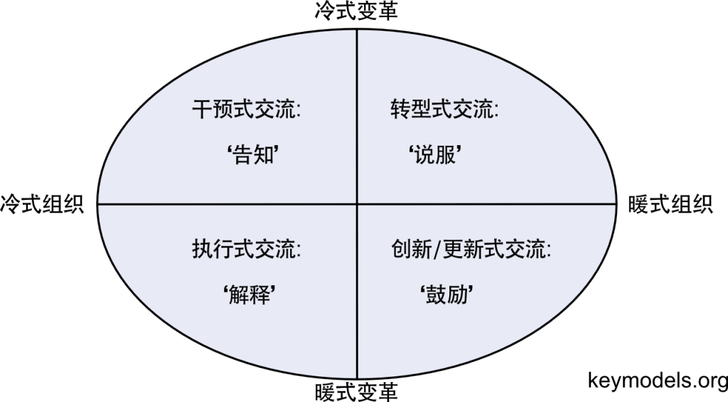 该模型的基本前提是,最合适的变革策略取决于一个组织是暖式还是冷式,以及变革的动机是暖式还是冷式。冷型是指由规则、条例、制度、结构和程序来驱动方向、控制和协调以获得结果的组织。在暖型的组织中,员工在一种共同的规范和价值观以及对方向的共同理解中使组织得以运转。