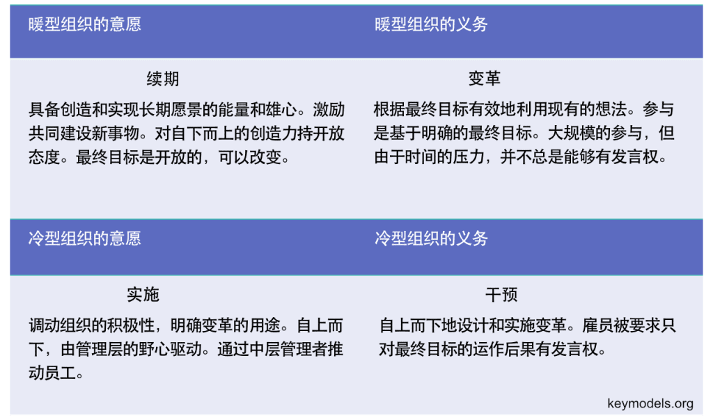 该模型的基本前提是,最合适的变革策略取决于一个组织是暖式还是冷式,以及变革的动机是暖式还是冷式。冷型是指由规则、条例、制度、结构和程序来驱动方向、控制和协调以获得结果的组织。在暖型的组织中,员工在一种共同的规范和价值观以及对方向的共同理解中使组织得以运转。