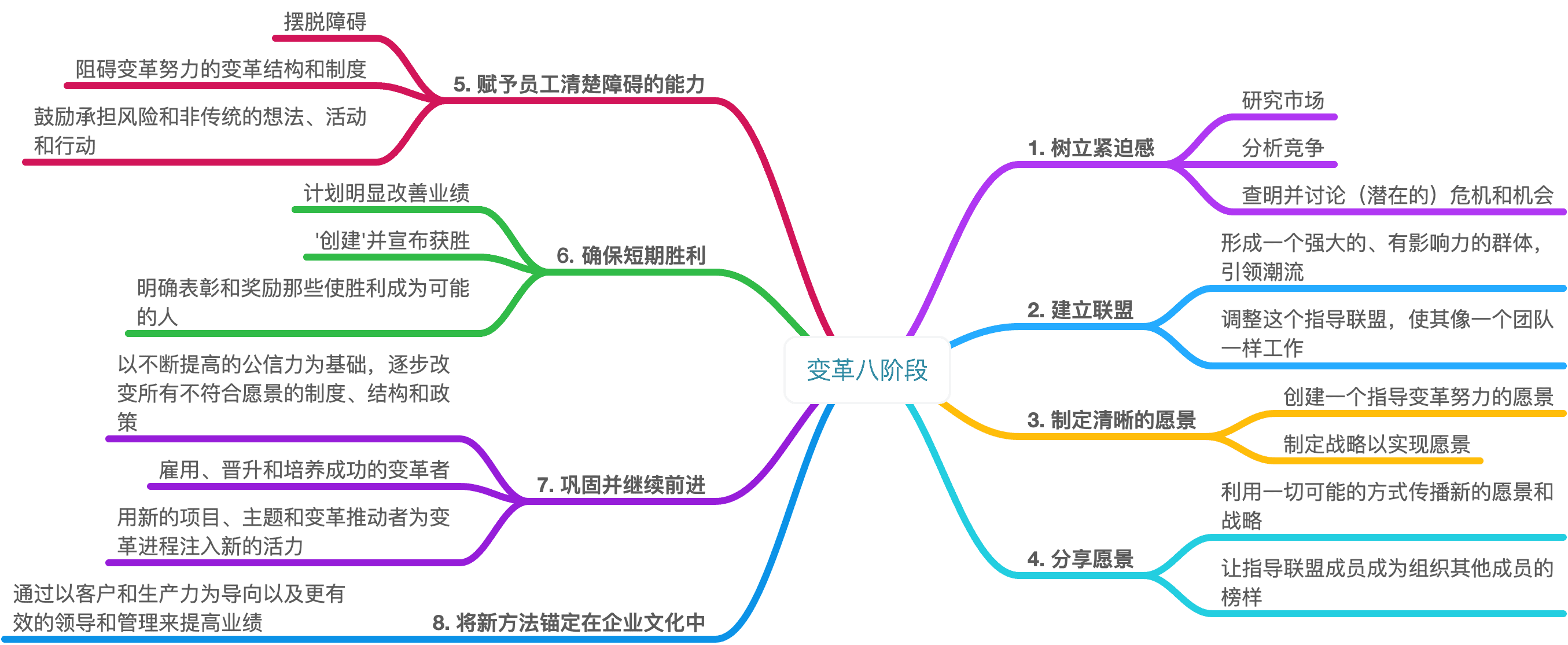 Kotter强调了经历以下清单中详细描述的所有八个阶段的重要性。然而,如果开展多个变革项目,一个组织很可能在任何时候都会发现自己处于该模型的一个以上的阶段。这些阶段如下:
