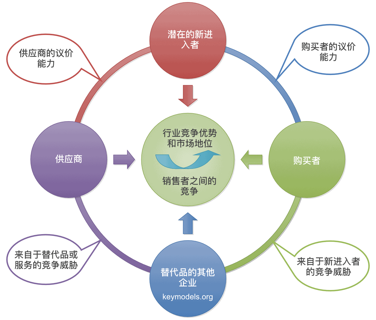 五种力量模型是根据五种基本力量从各个角度评估竞争领域的一种辅助手段。通过识别每一种力量的强弱和方向,可以迅速评估组织地位的强弱,以及在特定行业中获取利润或保持利润的能力。