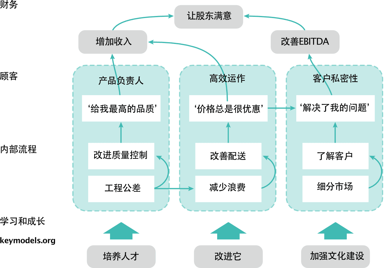 战略地图(Kaplan & Norton, 2004)描述了将无形资产转化为有形客户和财务成果的过程。战略地图有助于组织以一种凝聚、综合和系统的方式看待其战略(图下)。
