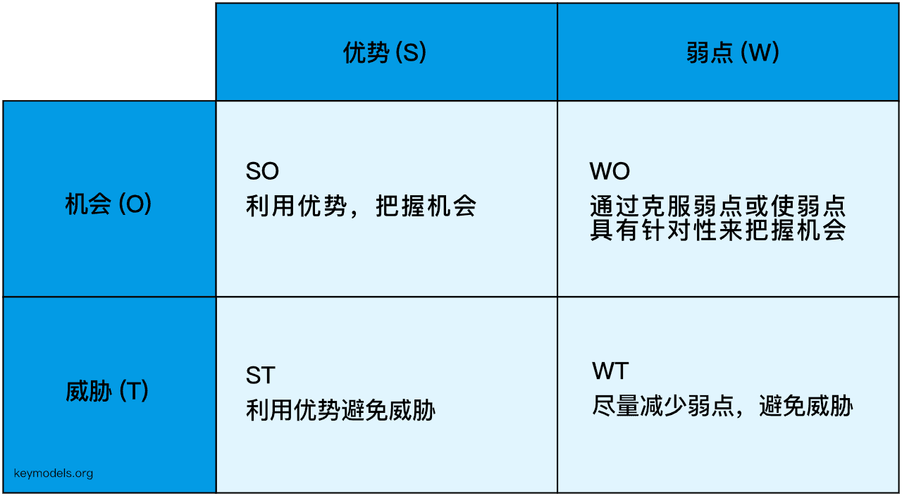 下一步是根据SWOT分析来评估公司要采取的行动。公司是应该集中精力利用自己的优势来把握机会,还是获取优势来捕捉机会?此外,公司是否应该积极尝试减少弱点和避免威胁?